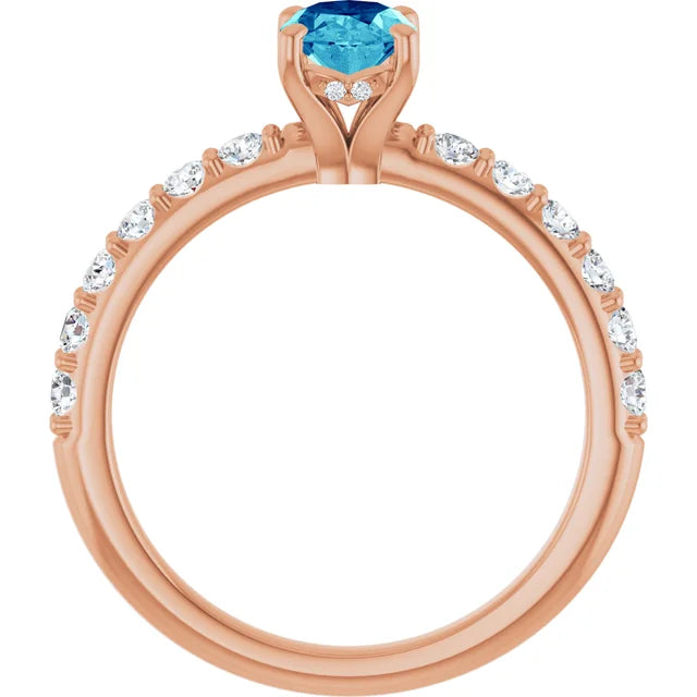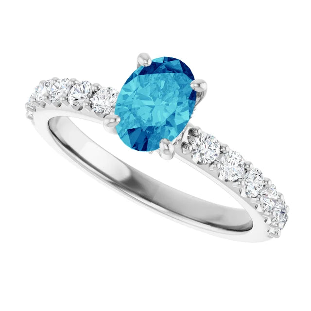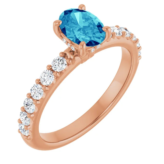 Oval blue lab-grown diamond ring with hidden halo of white diamonds. Sleek, modern 14k gold design—radiant sparkle with a unique touch. Certified.